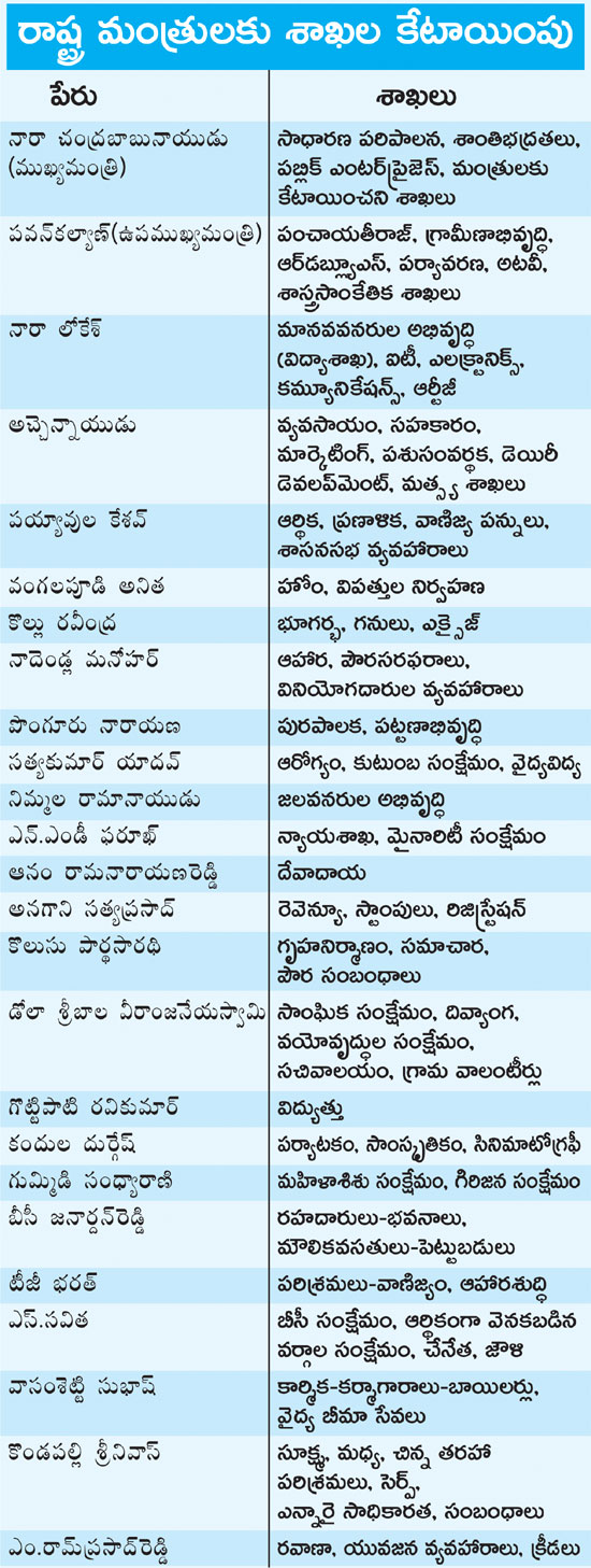 - మొదటిసారి మంత్రివర్గంలోకి వచ్చిన అనగాని సత్యప్రసాద్కు కీలకమైన రెవెన్యూ, రిజిస్ట్రేషన్, స్టాంపుల శాఖలను కేటాయించారు.