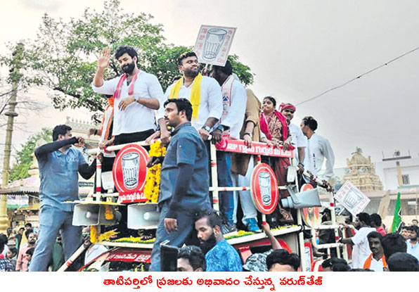 గొల్లప్రోలు, న్యూస్టుడే: బాబాయ్ పవన్ కల్యాణ్ను పిఠాపురం నుంచి అసెంబ్లీకి పంపితే మరింత సేవచేస్తారని సినీనటుడు వరుణ్తేజ్ అన్నారు. పిఠాపురం అసెంబ్లీ నియోజకవర్గంలో జనసేన అభ్యర్థి పవన్ కల్యాణ్కు మద్దతుగా వరుణ్తేజ్ గొల్లప్రోలు మండలంలోని పలు గ్రామాల్లో శనివారం రోడ్షో నిర్వహించారు. గాజు గ్లాసు గుర్తును చూపుతూ ఓట్లు అభ్యర్థించారు. తాటిపర్తి, కొడవలి, దుర్గాడ గ్రామాల్లో జరిగిన సభల్లో ఆయన మాట్లాడారు. ‘ఆత్మహత్యలు చేసుకున్న కౌలు రైతుల కుటుంబాలకు అప్పుచేసి మరీ పవన్ సాయం అందించారు. పిఠాపురం ప్రజలను కుటుంబసభ్యులుగా భావిస్తున్నారు. నియోజకవర్గంలోని ప్రతి గ్రామాన్నీ అభివృద్ధి చేస్తారు. చిరంజీవి సహా మా కుటుంబం మొత్తం పవన్ బాబాయ్ వెనకే ఉంది. కూటమి అభ్యర్థులను గెలిపించాలి’ అని పిలుపునిచ్చారు. వరుణ్తేజ్కు ప్రతి గ్రామంలో ఘన స్వాగతం లభించింది. తాటిపర్తిలో ఆయనకు మామిడిపండ్ల బుట్టను అందజేశారు.